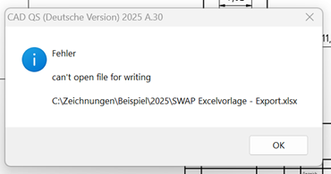 CAD QS verwendet die ausgewählte Vorlage, kopiert diese in das Zielverzeichnis und trägt die entsprechenden Werte ein. Ist die besagte Datei schreibgeschützt, können die Werte nicht in die kopierte Datei geschrieben werden.