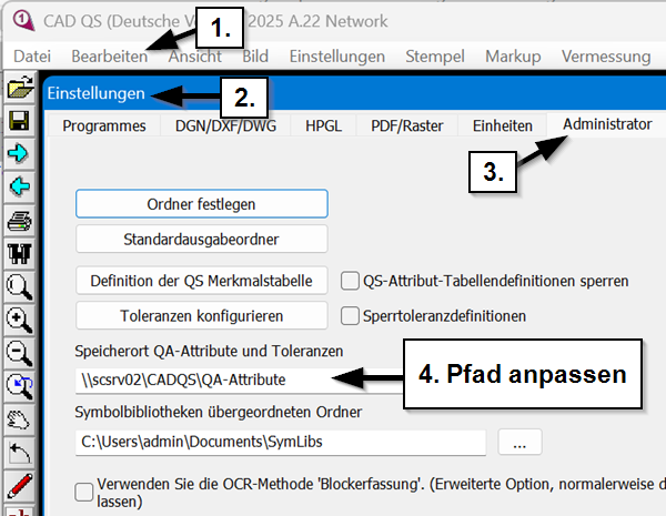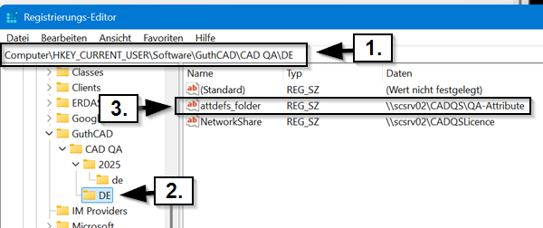 Alternativ kann man den Netzwerkpfad unabhängig vom Benutzer für den PC unter Computer\HKEY_LOCAL_MACHINE\SOFTWARE\WOW6432Node\GuthCAD\CAD QA\2025\de hinterlegen.