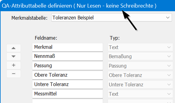 Tipp: Passen Sie die Freigaberechte von "Speicherort QA-Attribute und Toleranzen“ so an, dass unberechtigte Personen den Ordner und dessen Inhalt nicht verändern können. Unberechtigte Personen sollten nur Leserechte haben. Sie verhindern damit, dass unberechtigte oder unerfahrene Benutzer die Einstellungen verändern. In CAD QS wird ein entsprechender Hinweis angezeigt sobald der Benutzer versucht Änderungen vorzunehmen.